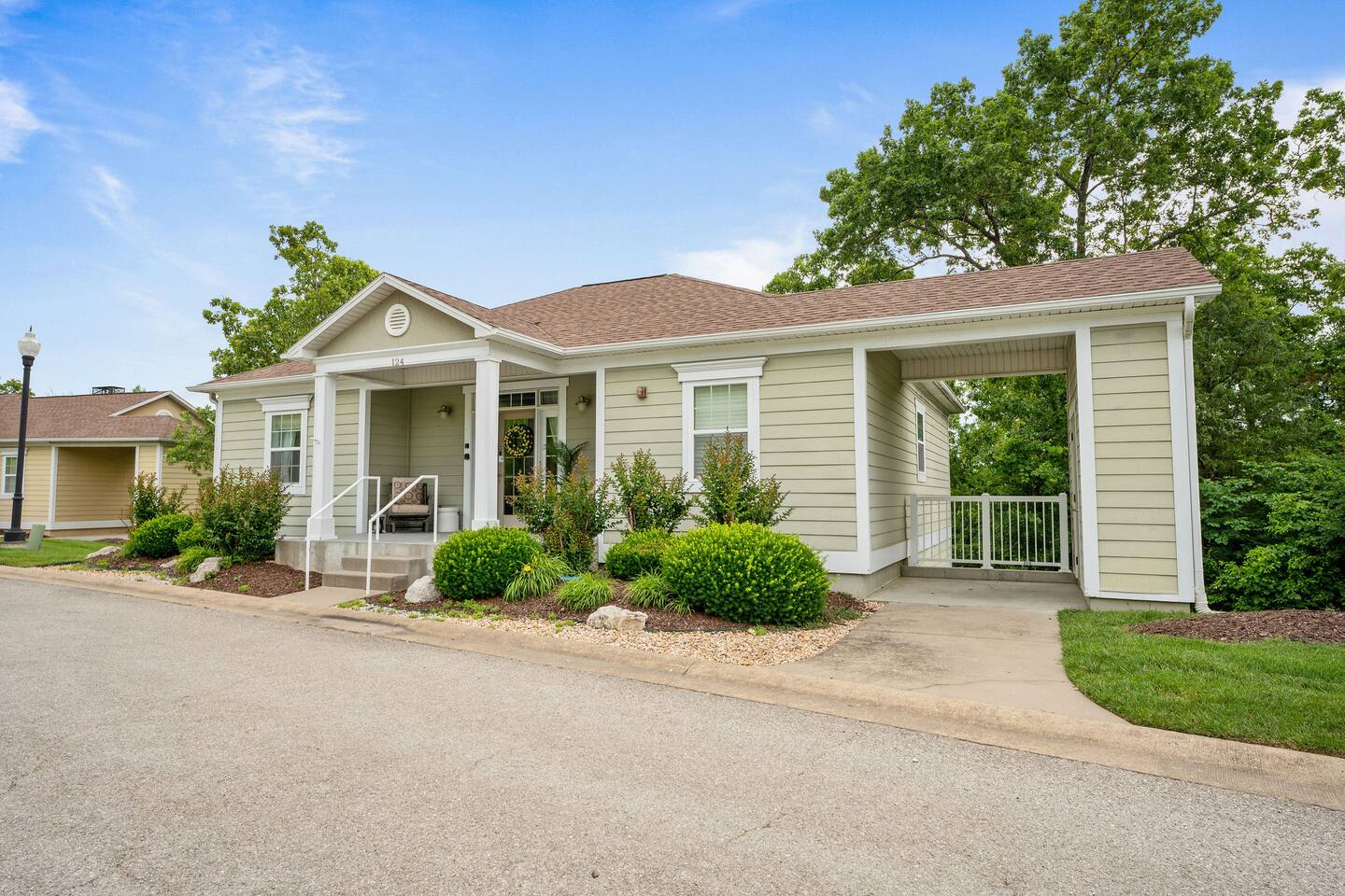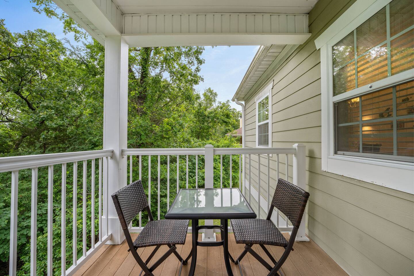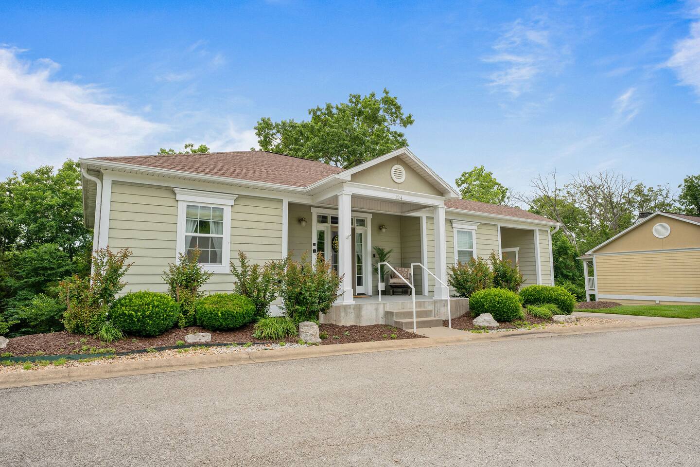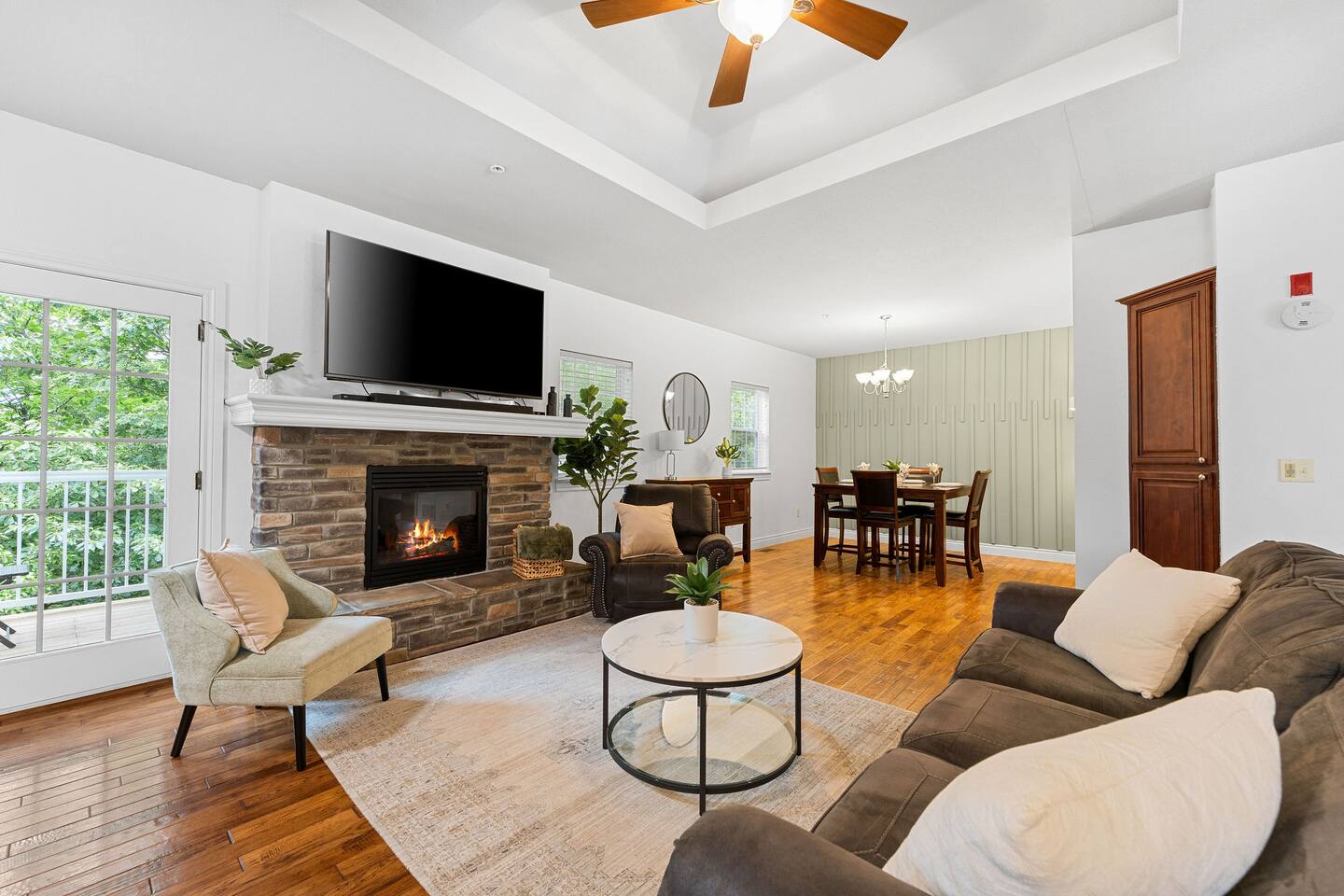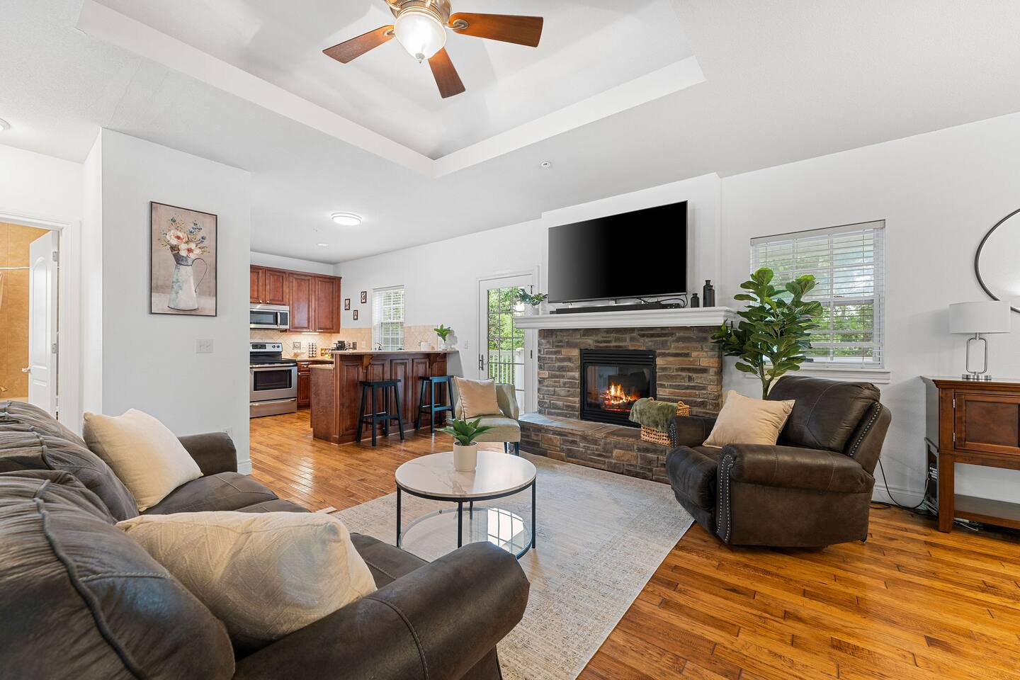 If you are looking for a modern cozy rental villa situated in a peaceful and quiet gold community, Villa Violà is IT ! This modern 2 bedroom, 2 bath which sleeps 8 offers everything you will need for a comfortable stay. We offer a fully equipped kitchen, an outdoor deck with grill, a decorated living room space with a fireplace, fast speed internet and smart tvs to log on to your streaming channels with your personal login. The open floor plan allows for the option of gathering for meals at the dining room or at the breakfast bar. Onsite Amenities: Resort amenities include onsite golf (require additional fees), tennis, outdoor pool, gym and hot tub in club house within walking distance. Avid golfers will appreciate the stimulating Public 18 Hole Course that is Branson Hills Golf Club which has tee times from 7:30pm – 6:30pm daily. It also offers a full restaurant and lounge for your convenience. The pool generally opens Memorial Day and is weather dependent and unheated. Location, Location, Location: Villa Violà is conveniently located at the corner of Branson Hills Parkway and Pinehurst Drive, just off the Branson Hills Parkways Exit on Highway 65. The villa is across the street from Branson Rec-Plex which offers hiking trails, playgrounds and ball parks in addition to fitness and recreation facilities galore. Villa Violà is within 12 minutes of the new Convention Center, Branson Landing shopping center, Tanger Outlets, and the 76 strip which contains dining, theme parks, and live shows. Accessibility in Villa Violà: There are three steps at the front entrance and a walk-in shower. The rest of the villa is a single level. House Rules: - Smoking: NO smoking or vaping inside the villa -Pets: Though we love our animals, we want to ensure that everyone can enjoy the villa without worrying about pet allergies. So unfortunately, NO pets are allowed. - Parties or Events: To be respectful to our neighbors, we don’t allow parties, events or loud noise after 10PM. We strive to provide you with a Trademark Level of service.