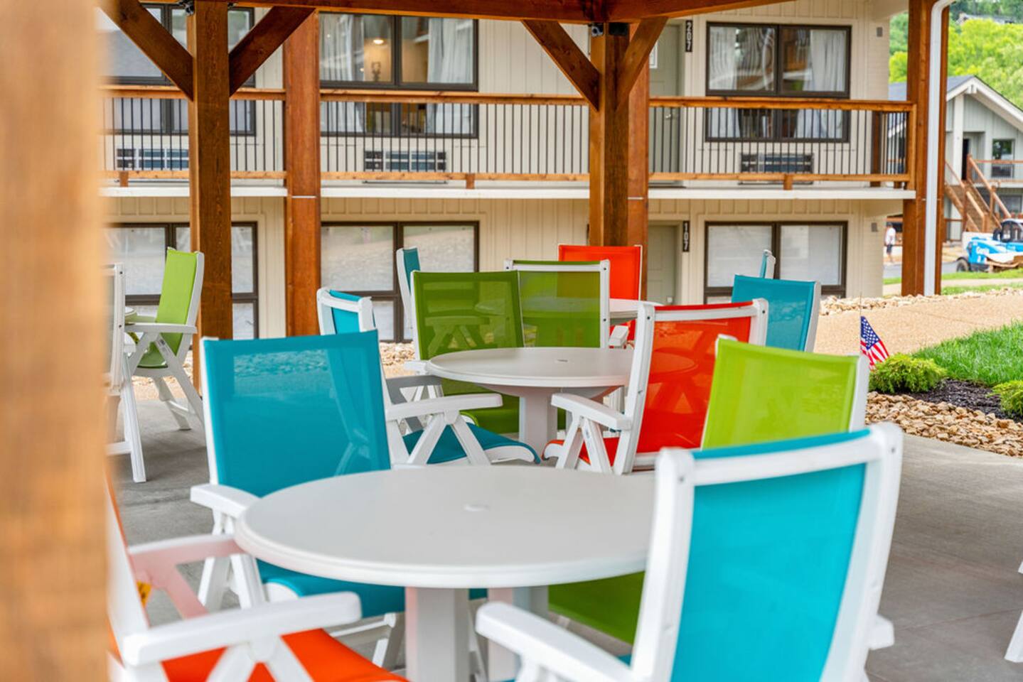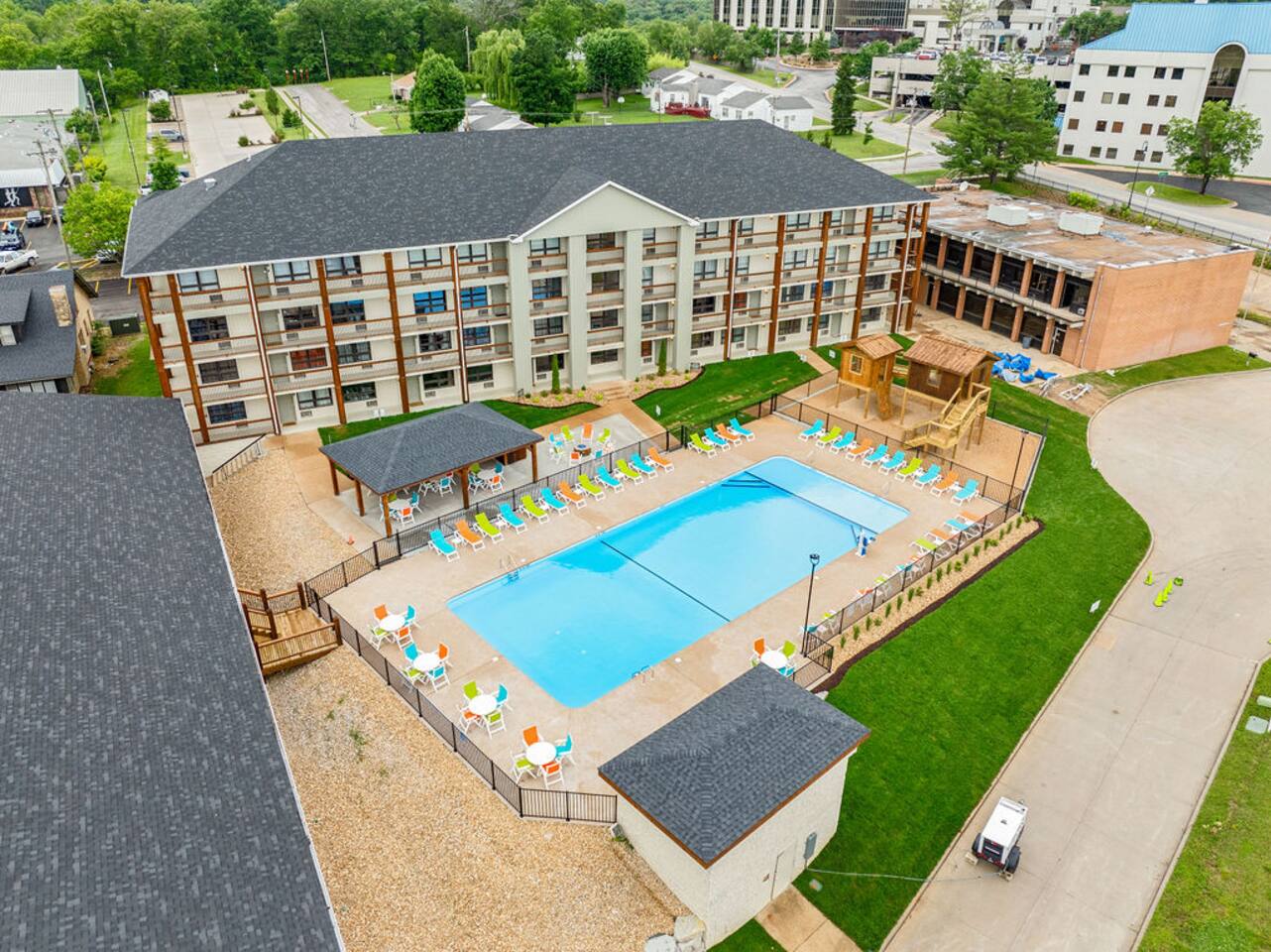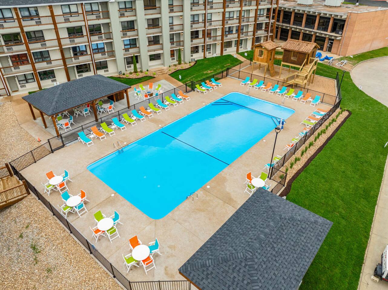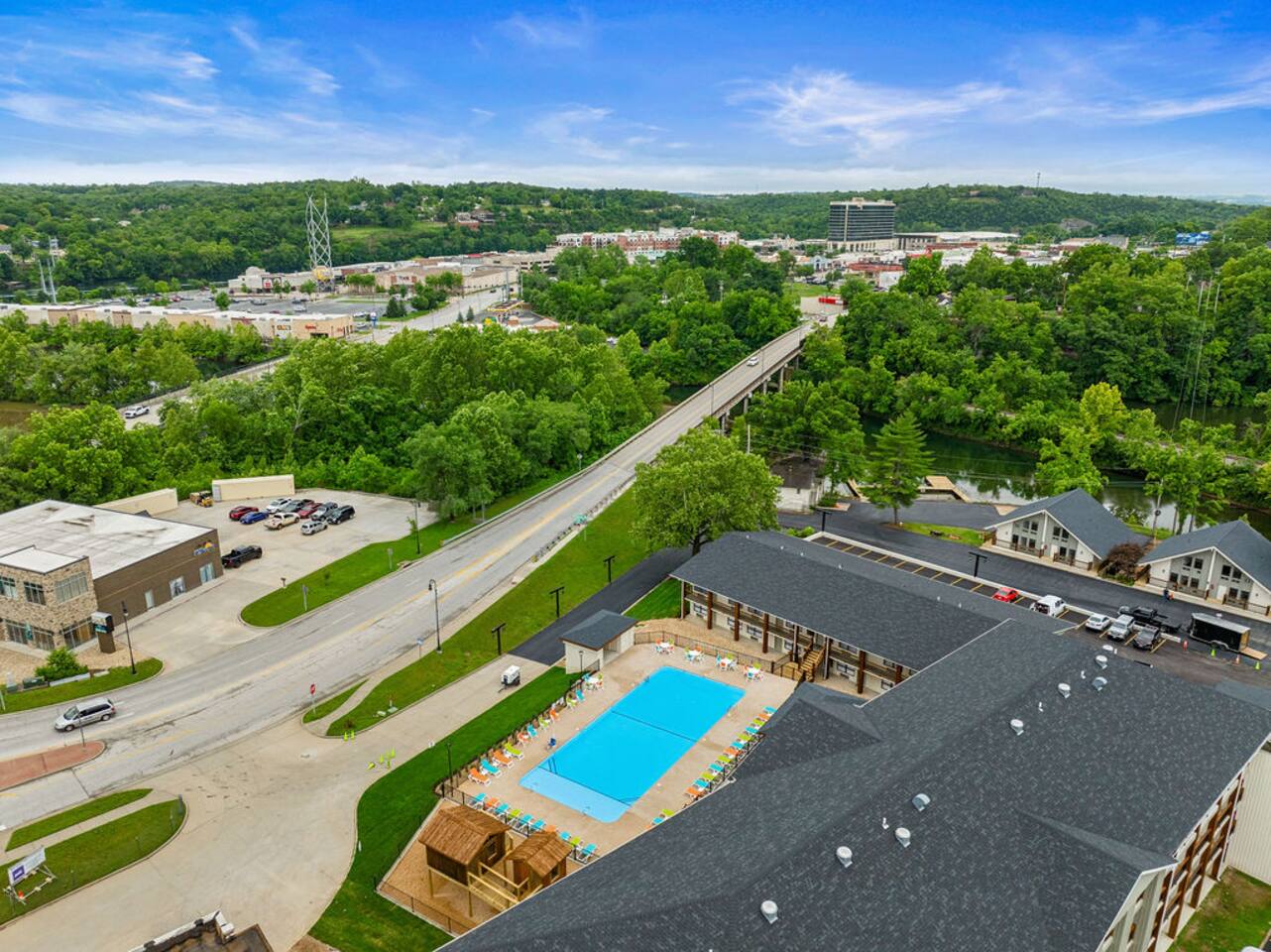 Happy Hideout, is a beautiful two bedroom, two bathroom (shower/tub combo), very tastefully decorated and spacious condo with brand new furniture and appliances, including one king size bed and two full size bunk beds in the guest bedroom to sleep six people total. The condo provides complimentary bottled water, coffee (ground and Keurig), tea, sugar, and creamer as well as board games for you and family to enjoy - including a life-size wall Tic-Tac-Toe game! You will be hard pressed to find a better deal in the lake area. The resort is conveniently located on Roark Creek with a community boat launch and access to Lake Taneycomo. The condo is less than a mile from the historic downtown and Branson Landing, with the strip close by, and Silver Dollar City only 14 miles away. Your room has a direct view to the resort’s amenities, which include an outdoor pool, gazebo, playground, and fire pit (scheduled to be completed May 31st). An additional $30 provides you and your family access to the indoor pool and gymnasium (readily available). Access via elevator or stairs. Includes digital self-check-in. Free, non-reserved parking is available for up to two vehicles. Additional units and the pool are currently under construction, with workers in the area between 8am and 5pm. The on-property coin-operated laundry and outdoor pool is expected to be completed May 31st.